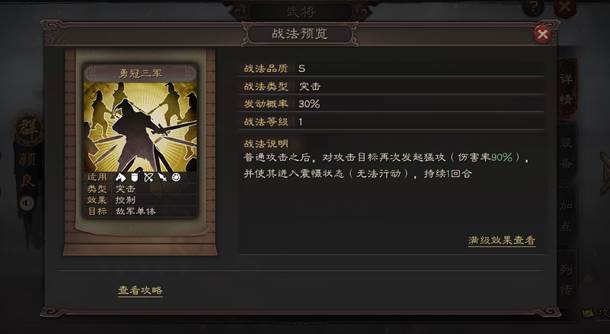 传承战法【盛气凌敌】,战斗前2回合使敌军群体2人有90%的几率被缴械,无法普攻。