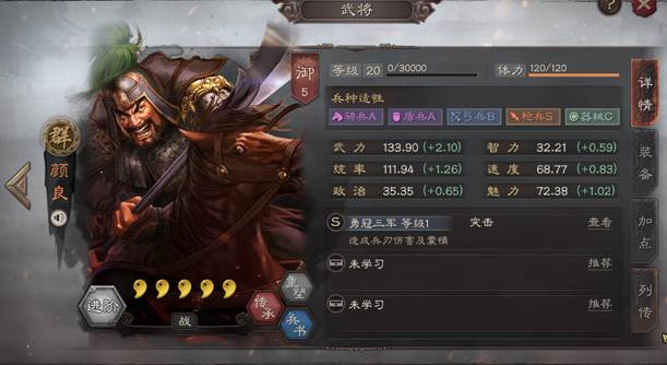 首先,颜良武力成长不错,智力低下,符合历史上勇而无谋的定位。兵种适性只有一个S枪,基本上只能组枪兵队伍了。