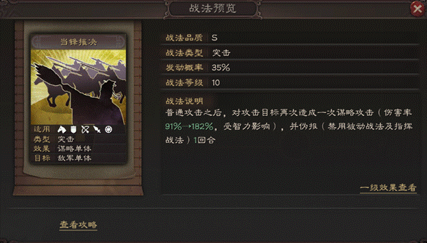 自带战法【勇冠三军】,突击类战法,造成兵刃伤害的同时附带震慑效果。